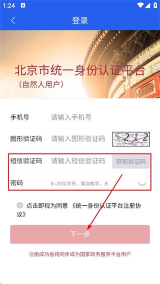 5、在注册页面,填写验证码,设置密码,点击下一步,完成注册流程。