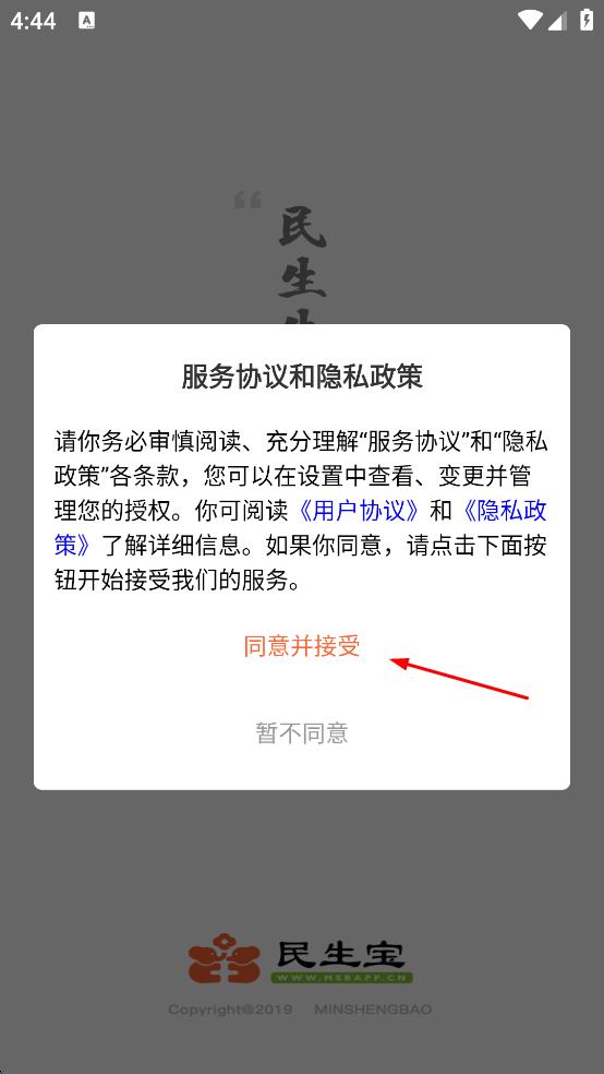 1、打开民生宝APP,会弹出服务协议和隐私政策页面,仔细阅读相关内容后,点击同意并接受按钮,进入到APP主界面。