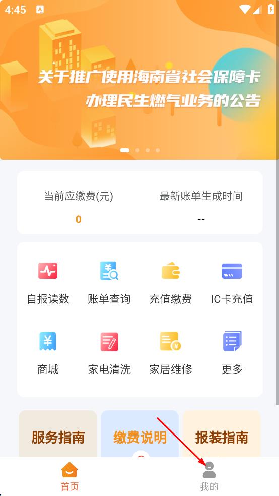 2、在APP主界面,能看到各类民生燃气业务功能入口,点击页面右下角“我的”选项,进入个人中心页面。