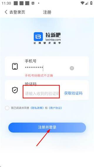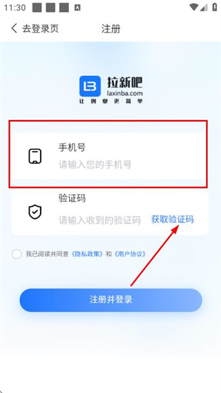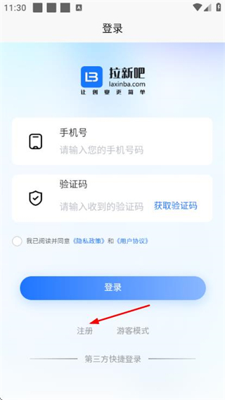 1、在拉新吧的登录页面,点击注册选项,进入账号注册页面。