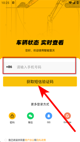 3、在登录页面,输入手机号码,点击获取短信验证码。