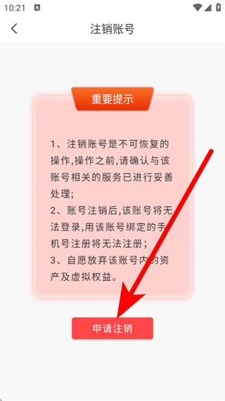 5、阅读重要提示后,点击申请注销,按流程完成账号注销。