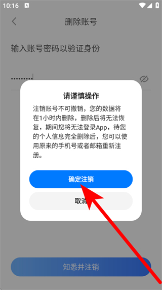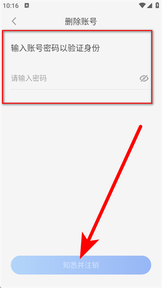 4、在删除账号页面,输入账号密码后,点击知悉并注销。