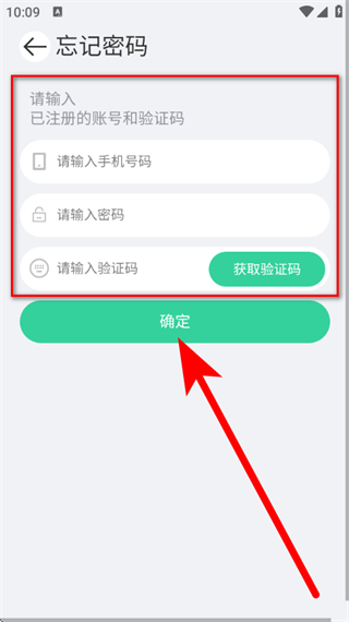 4、在忘记密码页面,输入手机号码,点击获取验证码并填写后,点击确定,完成密码重置。