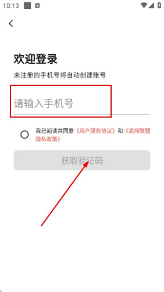 3、在手机验证登录页面填写手机号,勾选协议后,点击获取验证码。