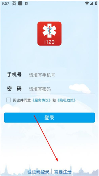 1、打开互联急救App,在弹出的服务协议和隐私协议窗口中点击同意按钮,进入登录页面。