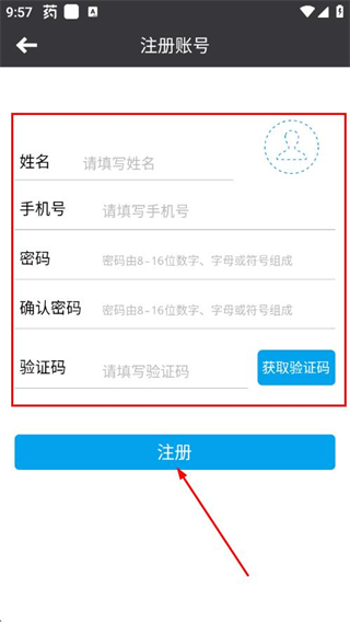 3、在注册页面填写姓名、手机号、设置密码,获取并填写验证码后,点击注册按钮完成账号注册。