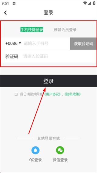3、在登录页面填写手机号和验证码,勾选协议后,点击登录完成账号登录操作。