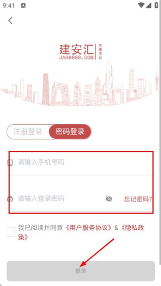 3、在密码登录页面填写手机号和密码,勾选协议后,点击登录按钮完成账号登录操作。