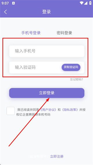 3、在登录页面填写手机号和验证码,勾选协议后,点击立即登录完成账号登录操作。