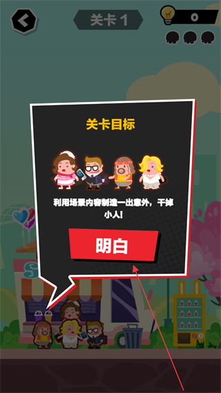1、点击关卡目标弹窗中的明白按钮,确认关卡任务利用场景内喷射物清理小人。