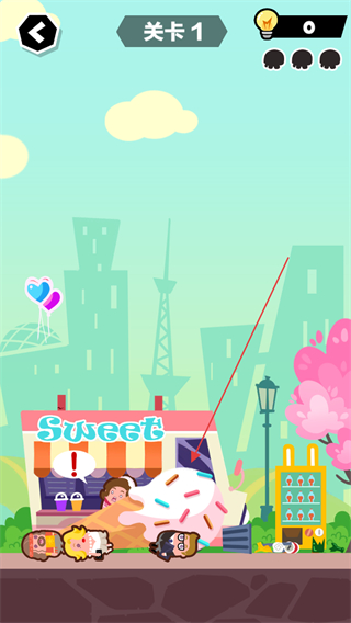 2、等待场景触发喷射效果如甜品喷射,利用喷射物击中目标小人。