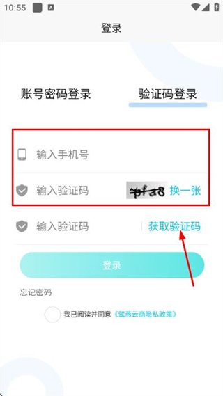 2、在验证码登录页面填写手机号,验证码,勾选协议后,点击获取验证码。