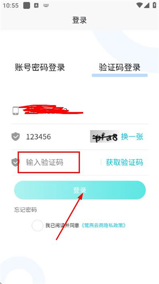 3、在验证码输入框中填写收到的验证码,点击登录完成账号的登录操作。