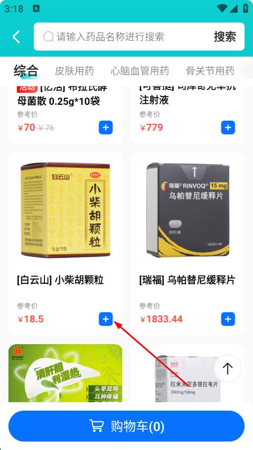 2、进入开药页面后,找到所需药品后,点击+号,将其加入购物车。