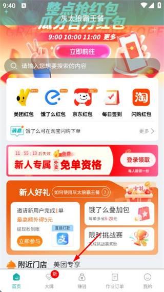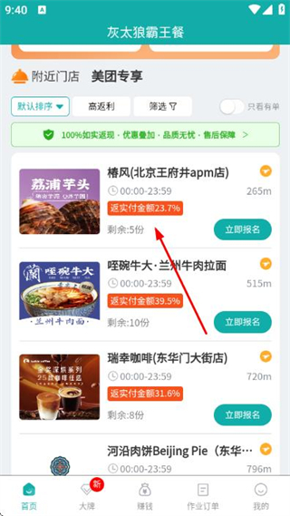 1、在首页点击美团专享区域,进入灰太狼霸王餐的店铺列表页面。
