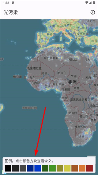 2、在光污染页面,查看底部图例,点击对应颜色方块可了解其代表的光污染程度含义。