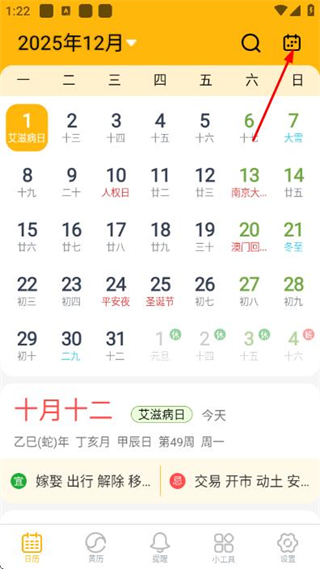 1、在日历首页,点击右上角的功能图标,进行日历的相关设置操作。