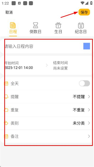 3、在日程添加页面填写信息后,点击右上角的保存按钮,完成该日程的添加。