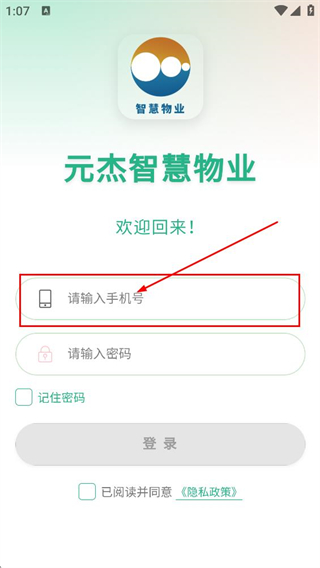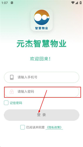 1、在元杰智慧物业的首页,点击底部我的,进入登录页面。