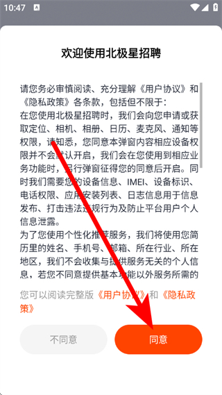 1、打开北极星招聘网,在弹窗中,点击同意。