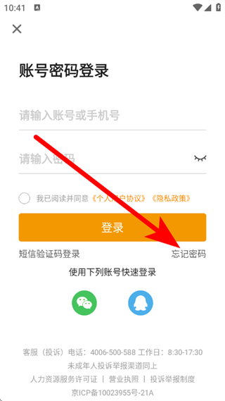 2、在账号密码登录页面,点击忘记密码,进入找回密码界面。
