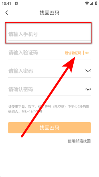 3、在找回密码页面,输入手机号,点击短信验证码。