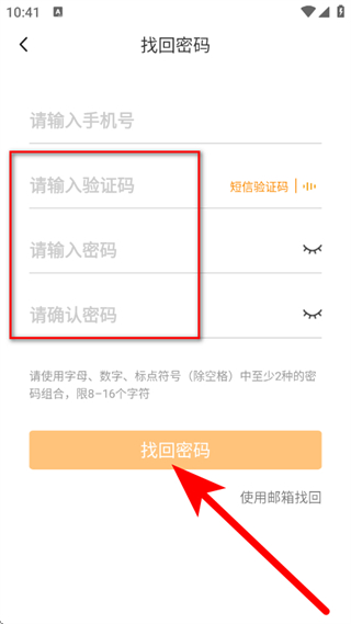 4、输入验证码,设置新密码后,点击找回密码,完成密码重置。