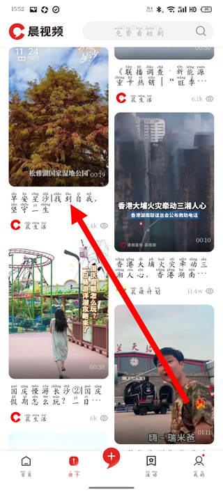 1、打开晨视频,在主界面点击底部故事,进入视频内容页面。