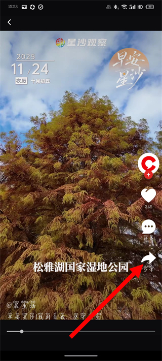 3、在视频播放页面,点击右侧分享按钮,弹出分享选项菜单。