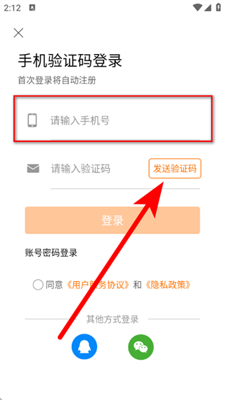 3、在登录页面,输入手机号,点击发送验证码。