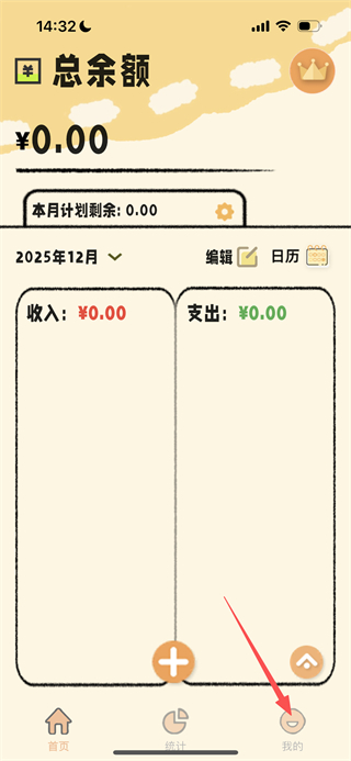 1、在鲸鲨记账首页,点击底部的我的选项,进入个人中心页面。