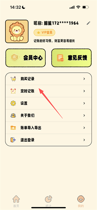 2、在个人中心页面,点击定时记账选项,进入定时记账设置页面。
