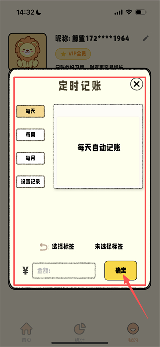 3、在定时记账页面,选择周期并填写信息后,点击确定按钮完成设置。