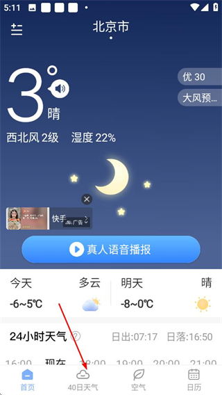 1、在朗朗天气首页,点击底部的40日天气选项,进入40日天气页面。