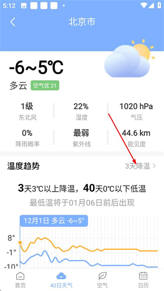 2、在40日天气页面,可查看近期的温度趋势及降温提示等信息。