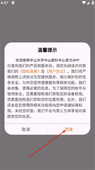 1、在温馨提示弹窗中,点击同意,进入登录页面。