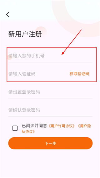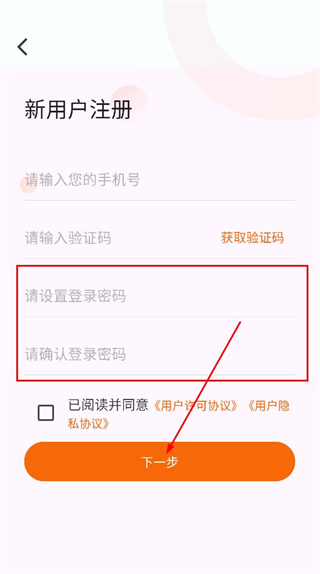 4、在新用户注册页面,设置登录密码并确认登录密码,点击下一步,完成注册操作。