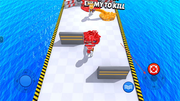 2、点击界面右侧的红色瞄准按钮,即可操控角色发射油漆,发射的油漆会覆盖地面与目标,需结合移动调整角度以提升覆盖效率。