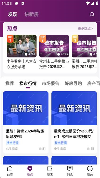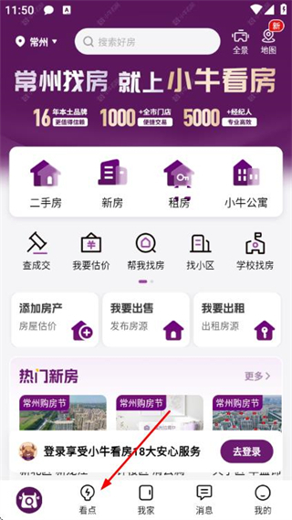 1、在小牛看房首页点击底部的看点选项,进入看点页面。