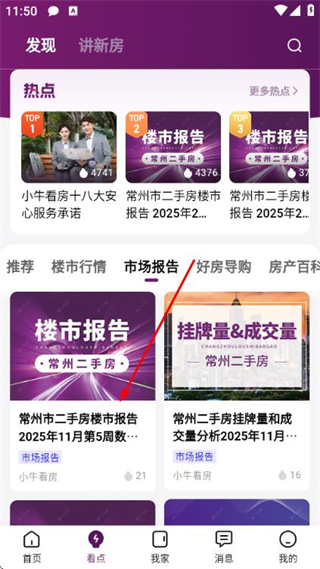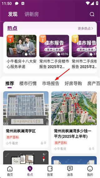 2、在看点页面点击市场报告选项,切换到市场报告板块。