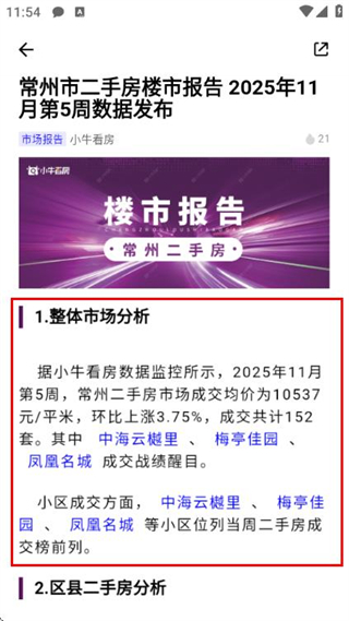 4、在楼市报告详情界面,即可看到市场分析数据等资讯。