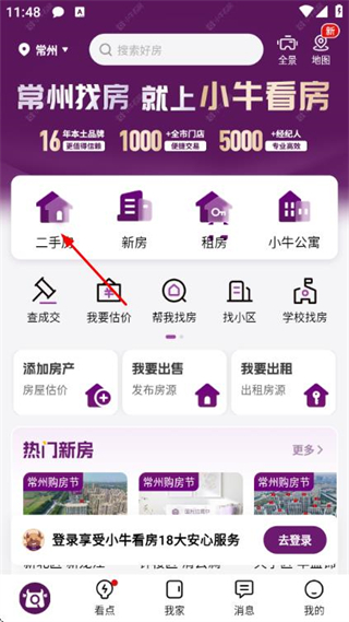 1、在小牛看房首页点击二手房选项,进入二手房房源列表页面。