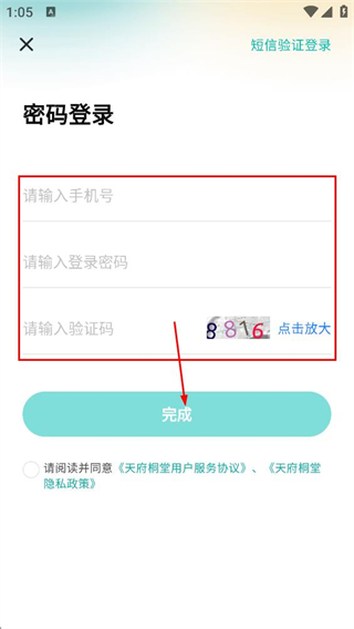 4、在密码登录页面,填写手机号-登录密码-验证码,点击完成,完成账号登录操作。