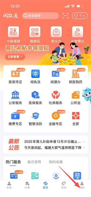 1、在闽政通首页,点击底部导航栏的我的,进入个人页面。