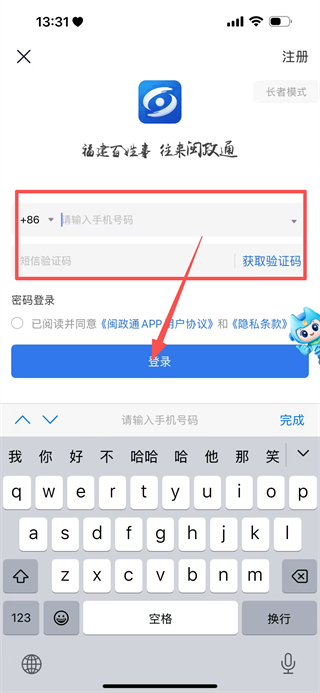 4、填手机号码和验证码,点击登录,完成闽政通的账号登录操作。