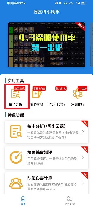 5、打开提瓦特小助手公众号,在主页面点击“抽卡分析”