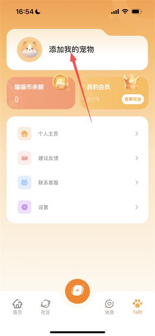 2、在该页面,点击添加我的宠物选项,进入宠物信息填写页。