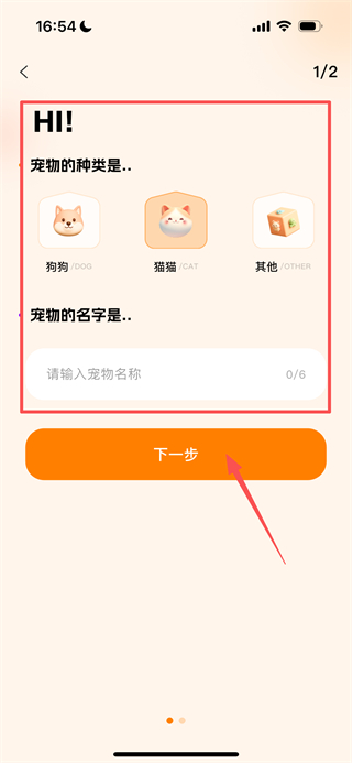 3、在填写页,选择宠物种类并输入名称后,点击下一步进入详情页。