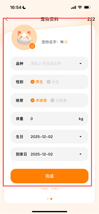 4、在详情页,完善宠物信息后,点击完成即可添加宠物。